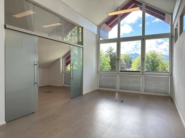 Diese helle und großzügige Büro-Praxisfläche im ersten Obergeschoss eines charmanten Wohn- und Geschäftshauses bietet eine perfekte Kombination aus Funktionalität und Atmosphäre. Auf rund 95 m² stehen Ihnen vier flexible Arbeitsräume, ein separates WC sowie ein praktischer Flurbereich zur Verfügung. Eine moderne Teeküche mit hochwertiger Einbauküche, inklusive sämtlicher Elektrogeräte, rundet das Angebot ab. Dank des wunderbaren Bergblicks und der zentralen Lage profitieren Sie nicht nur von einer angenehmen Arbeitsumgebung, sondern auch von einer ausgezeichneten Erreichbarkeit und Infrastruktur.