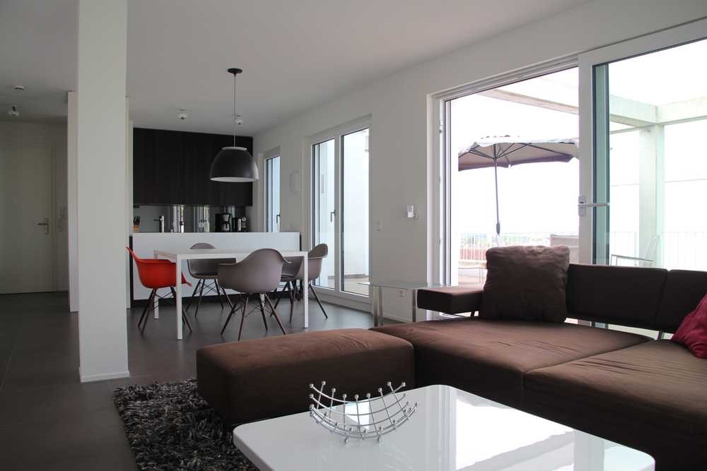 Modern und hochwertig möblierte 3-Zimmer-Penthouse Wohnung mit großer Terrasse (ca. 40 qm) und Tiefgaragen-Stellplatz (Mietpreis 100€) - passend für Pärchen und junge Familien. Wohnung befindet sich am Stadtrand, ideal zum Laufen, Joggen und Spazieren gehen. Die Wohnung befindet sich in der 4. Etage eines Neubau Objektes von 2015 mit Aufzuganlage und Tiefgarage. Neben dem hochwertigen Fliesen und Parkettboden, den bodentiefen Fenstern, sorgt eine Fußbodenheizung und Kühlung für einen angenehmen Wohnkomfort. Ebenfalls verfügt die Wohnung über ein automatisches Luftaustauschsystem in allen Räumen. Haus und Wohnung ist barrierefrei. Der Wohn-Essbereich verfügt über eine offene, hochwertige Designer Einbauküche, die keine Wünsche offenlässt. Anschließend an die Küche befinden sich ein Essplatz für bis zu sechs Personen sowie ein einladendes großes Sofa und ein Smart-TV mit Sky Receiver. Die große Terrasse ist von Küche, Esszimmer und Wohnzimmer begehbar. Sonnenschirm, Tisch, Stühle und Sonnenliege vorhanden. Das Hauptschlafzimmer ist mit einem Doppelbett (1,80x2m) ausgestattet. Eine Einbauschrankwand incl. Tresor sorgt für ausreichend Stauraum. Ein Smart TV mit Sky Anschluss ist ebenfalls vorhanden. Das zweite Schlafzimmer ist mit einem Einzelbett, großem Einbauschrank, einem Schreibtisch und Drucker ausgestattet. Kann daher als Büro, Kinder- oder Gästezimmer genutzt werden. Das großzügige Tageslichtbad verfügt über eine bodengleiche Dusche mit Handbrause und Unterputz Regendusche, einen großzügigen Waschtisch, eine Badewanne und eine Toilette. Handtücher sind vorhanden. Zusätzlich verfügt das Apartment über ein weiteres Gäste-WC. Im Keller des Hauses befindet sich ein gemeinschaftlicher Waschraum, in dem eine Waschmaschine und ein Trockner zur Eigennutzung zur Verfügung stehen.