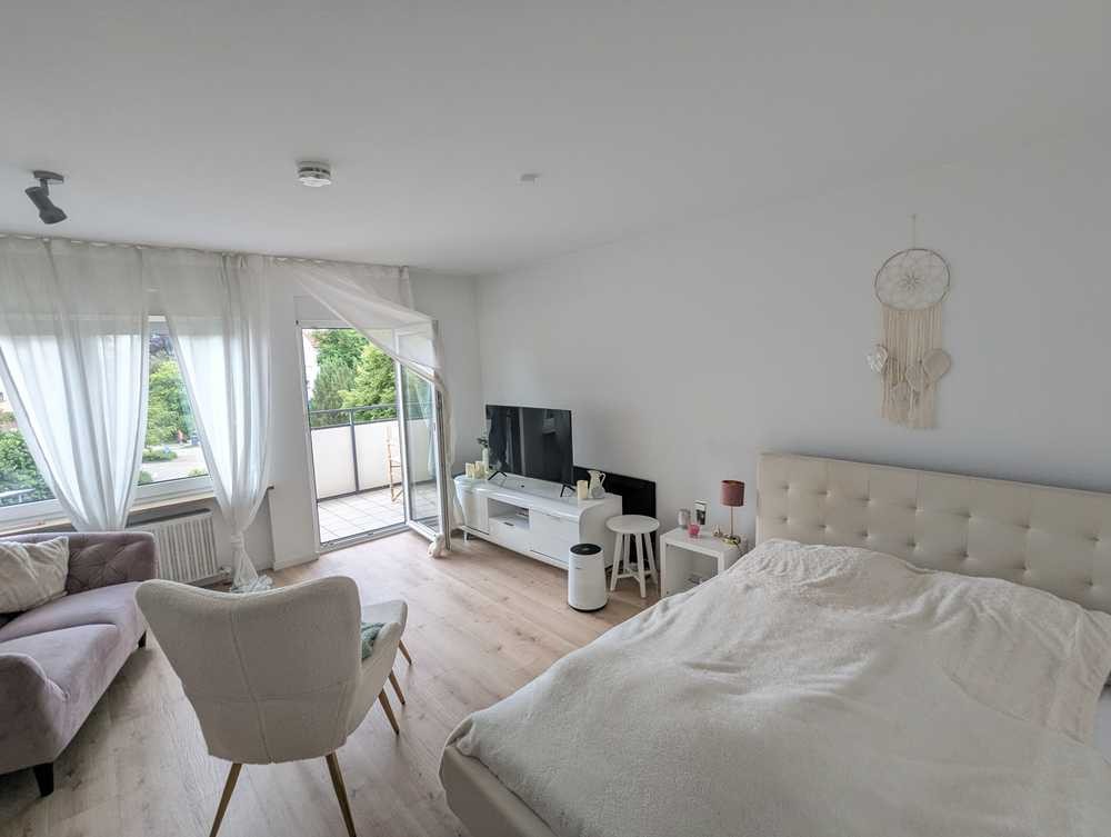 Der Wohn- und Schlafbereich (ca. 18 m²) ist quadratisch geschnitten, lässt sich optimal möblieren und bietet direkten Zugang zum sonnigen Südbalkon – perfekt für einen Kaffee am Morgen oder entspannte Feierabende.