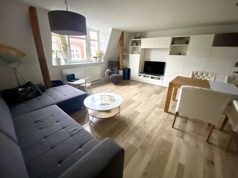 Im unteren Teil der Wohnung befinden sich Küche, Bad, Wohnzimmer und ein Kinderzimmer. Über eine Treppe gelangt man in einen weiteren großen Raum nach oben mit Dachschrägen, der bisher als Schlaf- und Arbeitszimmer genutzt wurde.