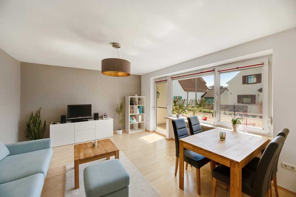 Vom Wohnzimmer gelangen Sie auch auf den Balkon, auf welchem Sie den ganzen Tag Sonne tanken können.