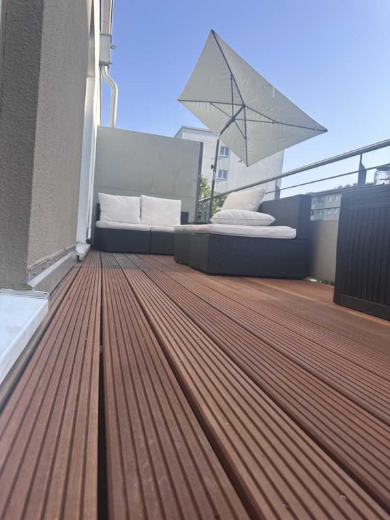 Der große Südwestbalkon mit neuen, hochwertigen Dielen und frischen Fassadenfarbe lädt zu entspannten Feierabend oder geselligen Familien und Freundschaftstreffen ein. Die hochwertige Ratanmöbel kann nach Bedarf auch übernommen werden.