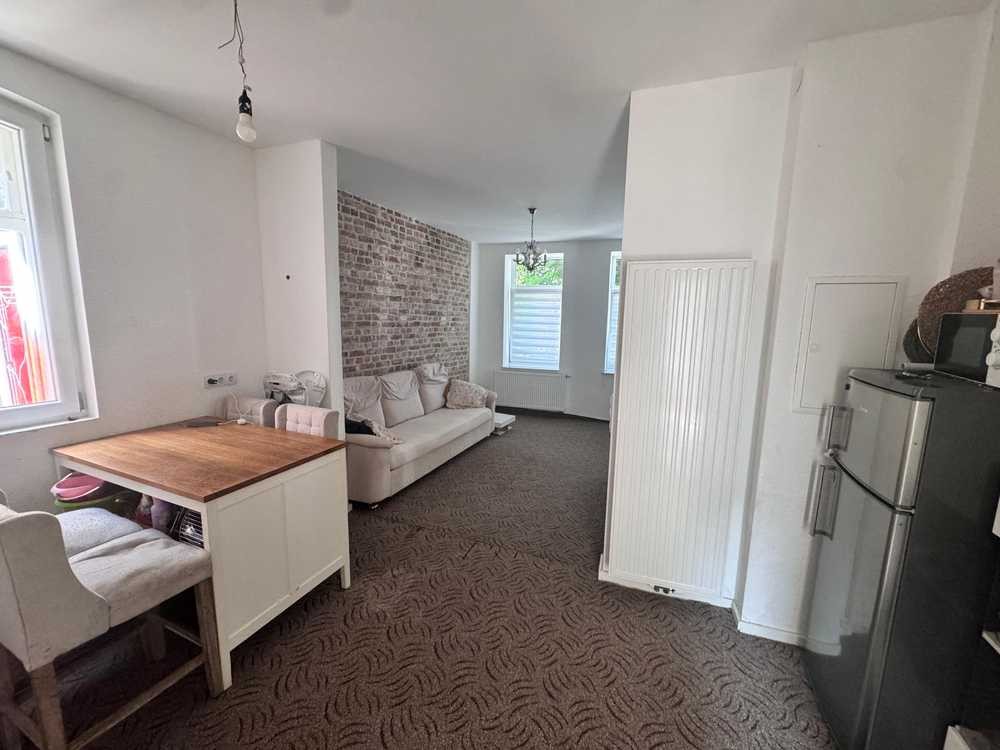 Beim Betreten der Wohnung empfängt Sie ein Flur, der Privatsphäre beim Eintreten von Gästen schafft. Direkt anschließend öffnet sich ein großzügiger Wohn- und Küchenbereich, der durch eine freigelegte Backsteinwand einen rustikalen Charme erhält und dank großer Fenster von viel Tageslicht durchflutet wird.