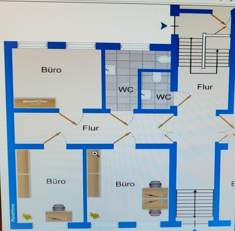 Die Büroräume befinden sich auf der linken Seite des Haupteingangs im Erdgeschoss, also Kundenfreundlich.