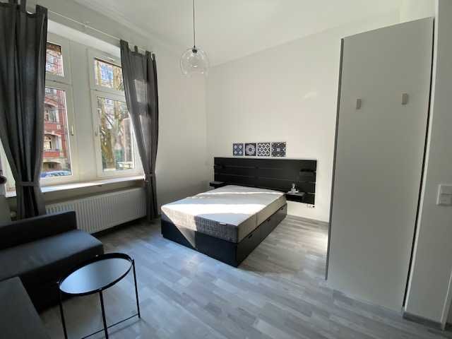 Das Apartment ist komplett neue ausgestattet. Die Wände wurden glatt gespachtelt und mit Malerflies tapeziert. Die Wohnung ist ausgestattet mit neuem modernen hellgrauem Laminat und einer neuen Elektroverteilung. Zur Abdunklung des Fensters finden Sie einen Rolladen, sowie modern zur Einrichtung passende Vorhänge als Sichtschutz.