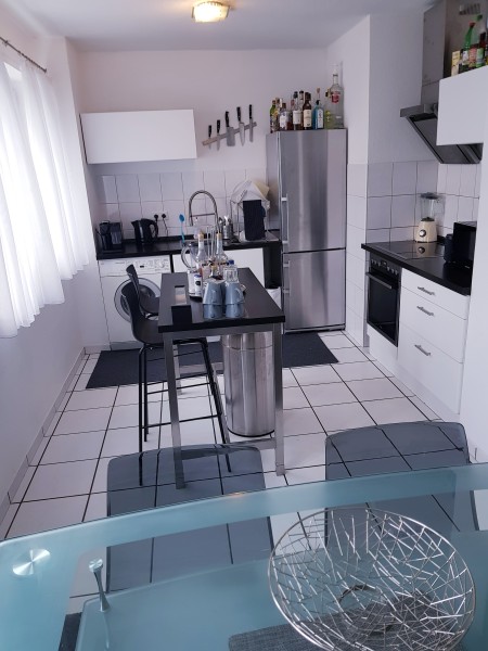 Voll eingerichtete Küche mit Induktionsherd, Backofen und Waschmaschine