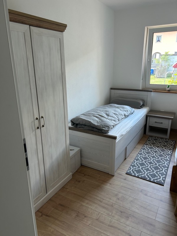 Bis Mitte September wird das Zimmer vollständig und stilvoll eingerichtet sein. Es verfügt aktuell nur über ein Einzelbett (90x200 cm) mit Nachttisch, einem Kleiderschrank (beides neu) und einem Bücherregal. Dieses soll noch um einen kleinen Schreibtisch und einen Sessel ergänzt werden. Oder aber nach Wunsch selbst vervollständigt werden. Bilder folgen!