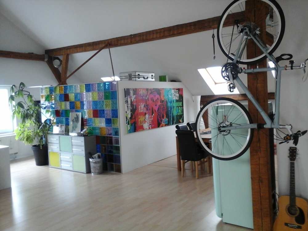 Zur Vermietung steht eine helle, ruhige Loftwohnung in einem 4 Parteienhaus mit ca. 120 qm und kleiner Dachterasse mitten in Kulmbach. Das Haus ist zum Marktplatz fußläufig in ca. 3 Minuten zu erreichen und ist mit einem Tageslichtbad mit Rundeckbadewanne und Rundeckdusche ausgestattet. Der Boden ist mit neuem Laminat ausgestattet und wie auf dem Foto ersichtlich, ist als Raumtrenner eine Glasbausteinwand eingefügt worden. Derzeit wird diese Raumabtrennung als Schlafabteil genutzt da ( bis auf das Bad/ Toilette ) es sich um einen einzigen Raum handelt. Die Heizkörper, sowie die gesamte elektrische Anlage wurde vor wenigen Jahren komplett erneuert, ebenso wie die Fenster und die gesamte Isolation der Dachschrägen. Die jährliche Abrechnung nimmt eine Fachfirma vor mit jeweilig präziser und nachvollziehbarer Berechnung der Verbrauchswerte. Für die Reinigung der Treppen, der Außenwege, die Gartenpflege und die Schnee und Räumpflicht, sowie das bereitstellen der Wertstoffbehälter ( Hausordnung ) ist ein Hausmeisterdienst zuständig der seiner Tätigkeit zur vollsten Zufriedenheit nachkommt.