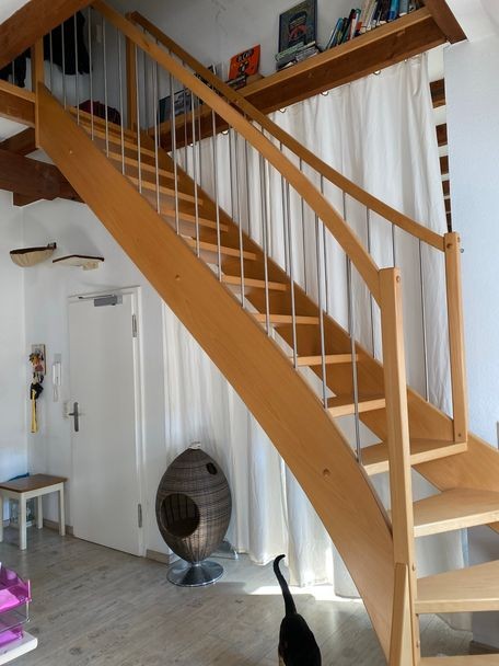 Es führt eine Treppe mit einer Türe zum WG Zimmer.