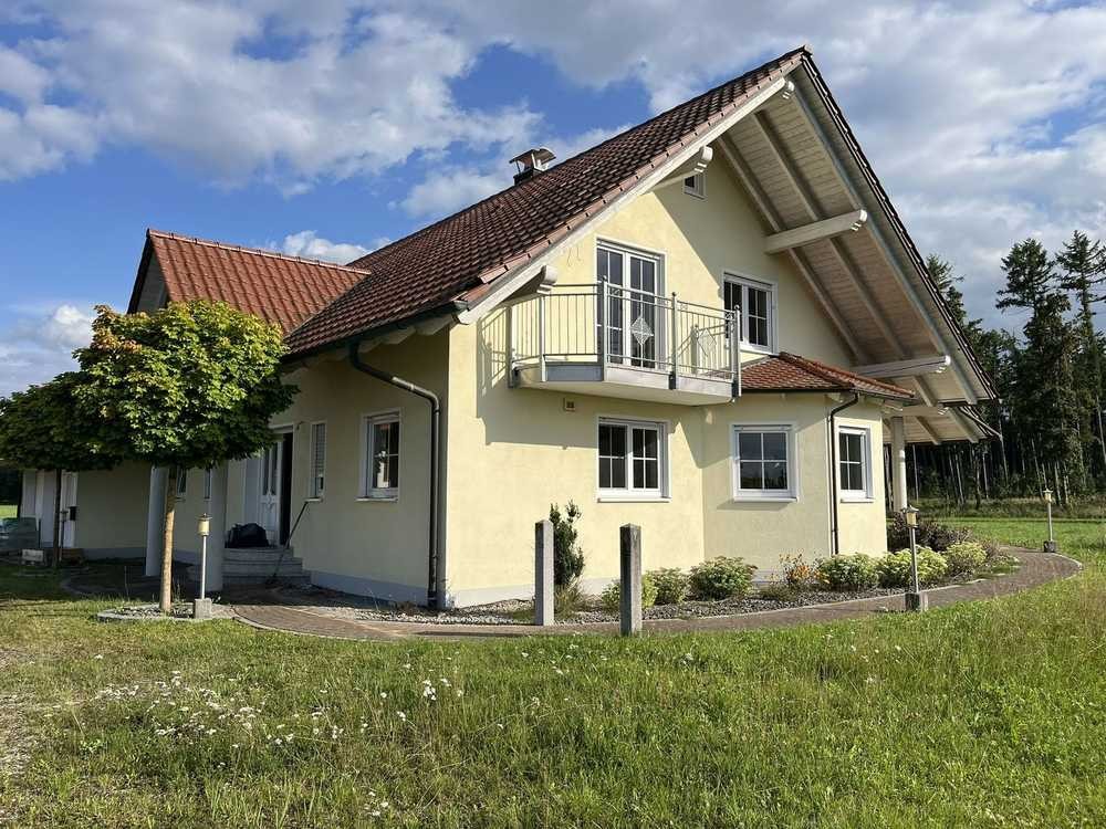 Helles Einfamilienhaus mit hochwertiger Ausstattung Dieses lichtdurchflutete Einfamilienhaus begeistert durch seine ruhige Lage inmitten der Natur und bietet gleichzeitig ein hohes Maß an Wohnkomfort. Großzügig geschnittene Räume, eine hochwertige Ausstattung sowie viel Außenfläche schaffen ein ideales Zuhause für Familien oder Paare mit Platzbedarf. Die moderne Einbauküche ist bereits im Mietpreis enthalten und bildet mit dem angrenzenden Ess- und Wohnbereich das Herzstück des Erdgeschosses. Zudem stehen hier zwei weitere Zimmer sowie ein Gäste-WC zur Verfügung. Im Obergeschoss befinden sich vier weitere Zimmer , eines davon mit Balkonzugang, sowie ein helles Tageslichtbad mit Badewanne und Dusche. Ein zusätzliches Bad im Untergeschoss sorgt für extra Komfort. Besonders praktisch: Die Doppelgarage mit direktem Hauszugang , zwei helle Kellerräume sowie der Dachspitz, der sich hervorragend als Stauraum eignet. Für entspannte Stunden im Freien laden zwei Terrassen mit Ost- und Westausrichtung ein – perfekt für Sonne zu jeder Tageszeit. Der großzügige Garten bietet viel Raum für individuelle Gestaltung und Freizeitaktivitäten.