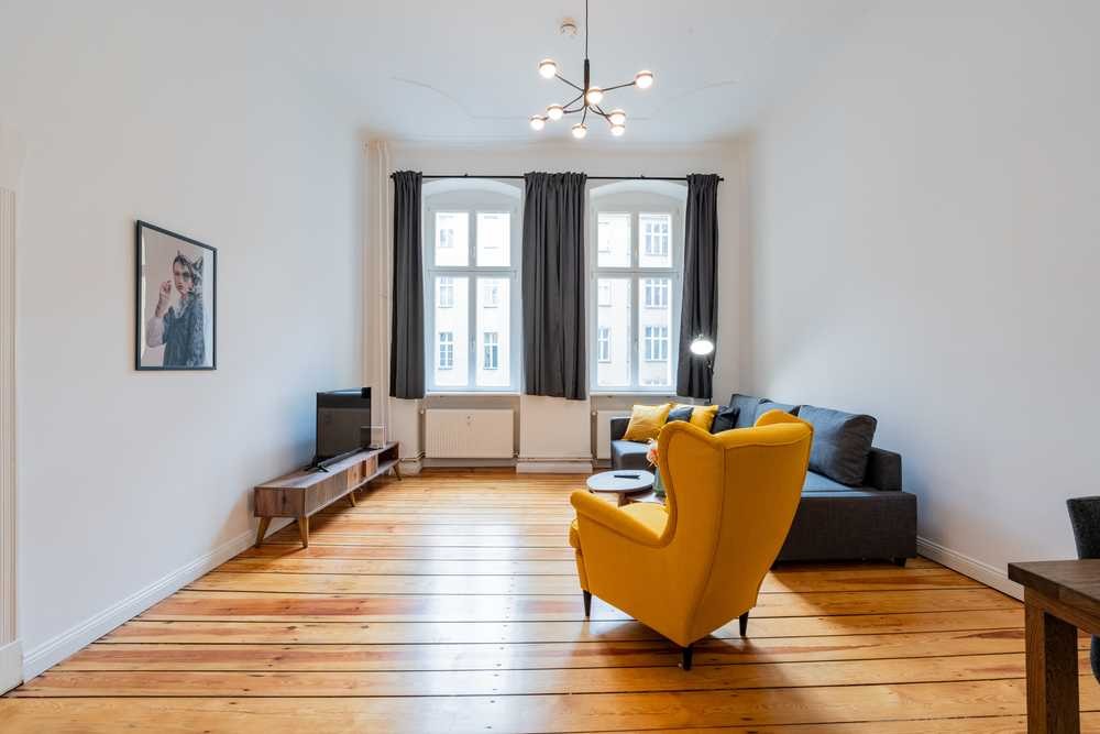 This very large two-room apartment is located in a beautiful typical Berlin old building. So the apartment also impresses with typical old building elements. The high ceilings give the already very large rooms a hall-like character. The apartment has a large bedroom, a living room, a kitchen large enough to accommodate many guests.