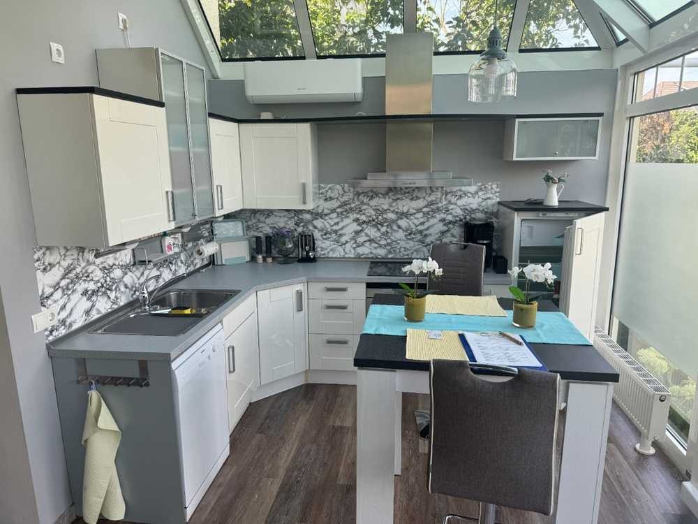 In der Wohnung befindet sich ein großer und heller Wohnküchenbereich mit Zugang in den Garten.