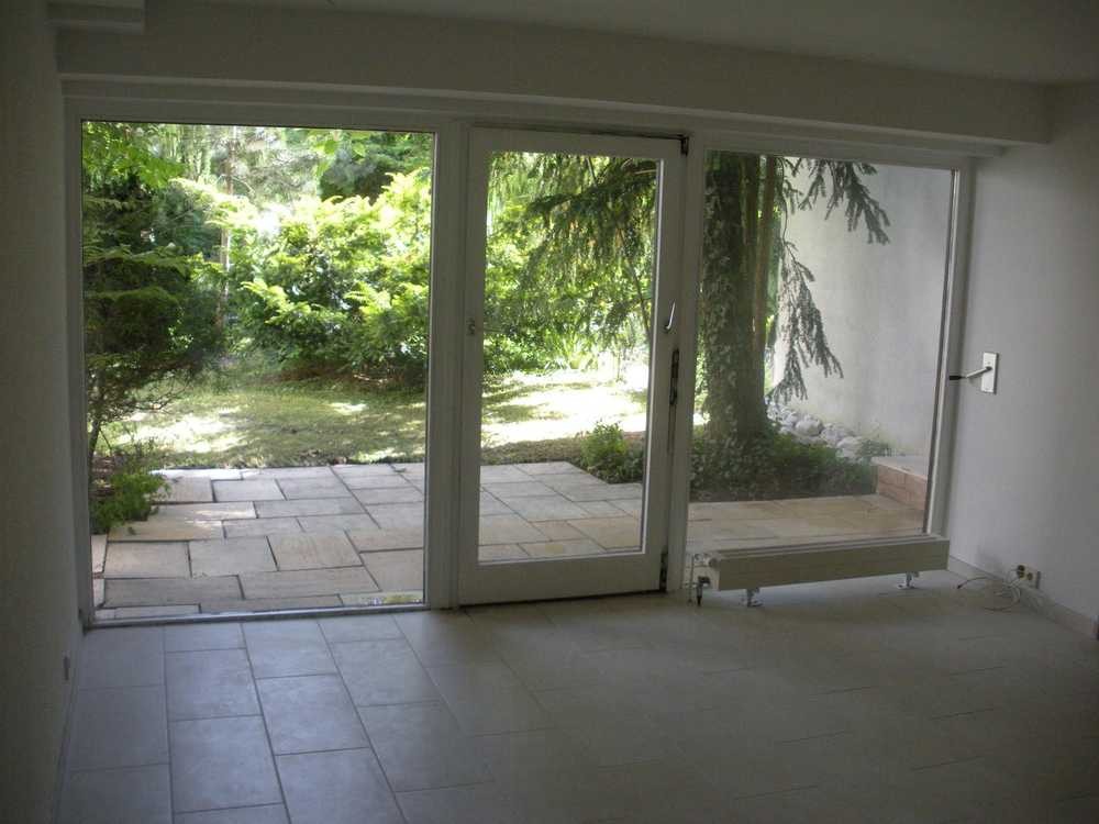 Großzügige, raumhohe Fenster schaffen viel Licht – mit Zugang zur Terrasse und zum Garten, um den Tag bei Sonne ausklingen zu lassen.