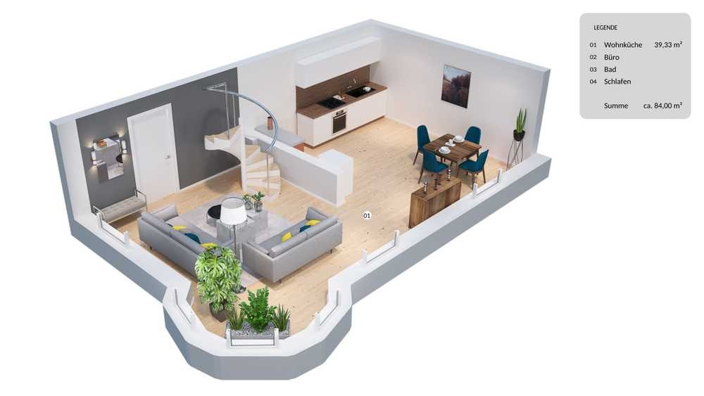 Durch die Wendeltreppe gelangen Sie in das Obergeschoss, in dem sich das Schlafzimmer, ein Arbeitszimmer und das Bad befinden. Über das Arbeitszimmer gelangen Sie in das 19 m² große Schlafzimmer. Das Tageslichtbadezimmer ist mit einer Eckbadewanne ausgestattet, so dass Sie auch hier erholsame Stunden verbringen können.
