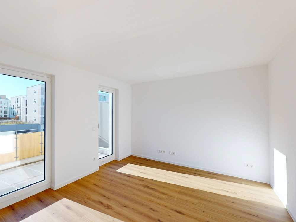 Die quadratisch geschnittene 2-Zimmer-Neubauwohnung ist über einen Laubengang erreichbar und wird in einem geräumigen Flur betreten. Daran anschließend finden Sie das Schlafzimmer, ein Abstellraum und ein Duschbad mit Waschmaschinenanschluss. Entlang an einem offenen Küchenbereich inklusive einer Einbauküche gelangt man in das helle Wohnzimmer, wovon der Zugang zum Balkon/zur Terrasse möglich ist.
