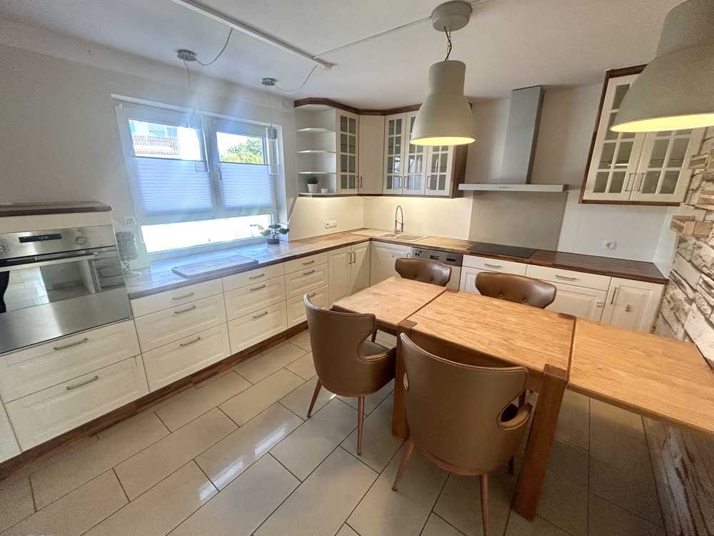 Die großzügige, helle Einbauküche lässt keine Wünsche offen. Das große Badezimmer ist mit zwei Waschbecken und zwei Spiegeln ausgestattet – ideal für Paare, die den morgendlichen Ablauf entspannt gemeinsam gestalten möchten. Zudem gibt es einen praktischen Einbauschrank im Bad für zusätzlichen Stauraum und eine Badewanne, die zum Entspannen einlädt. Das Wohnzimmer verfügt über einen schönen Durchgang zum Arbeitszimmer und eine eigene Treppe zum Garten, der nicht zur Mitbenutzung vorgesehen ist, aber einen traumhaften Ausblick auf die umliegenden Felder bietet.