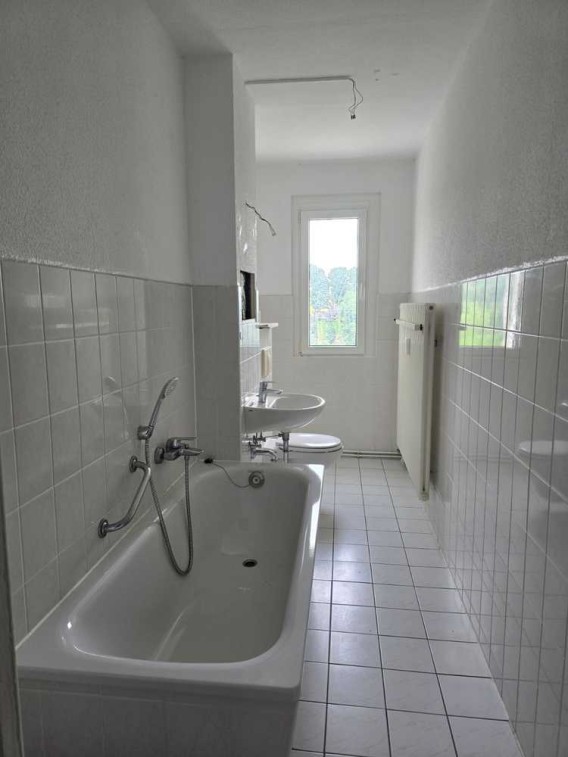 Die Wohneinheit ist aufgeteilt in ein Flur, ein Bad mit Wanne und Fenster, eine Küche mit Fenster, ein Schlafzimmer und ein Wohnzimmer mit Zugang zum großzügigen Balkon.