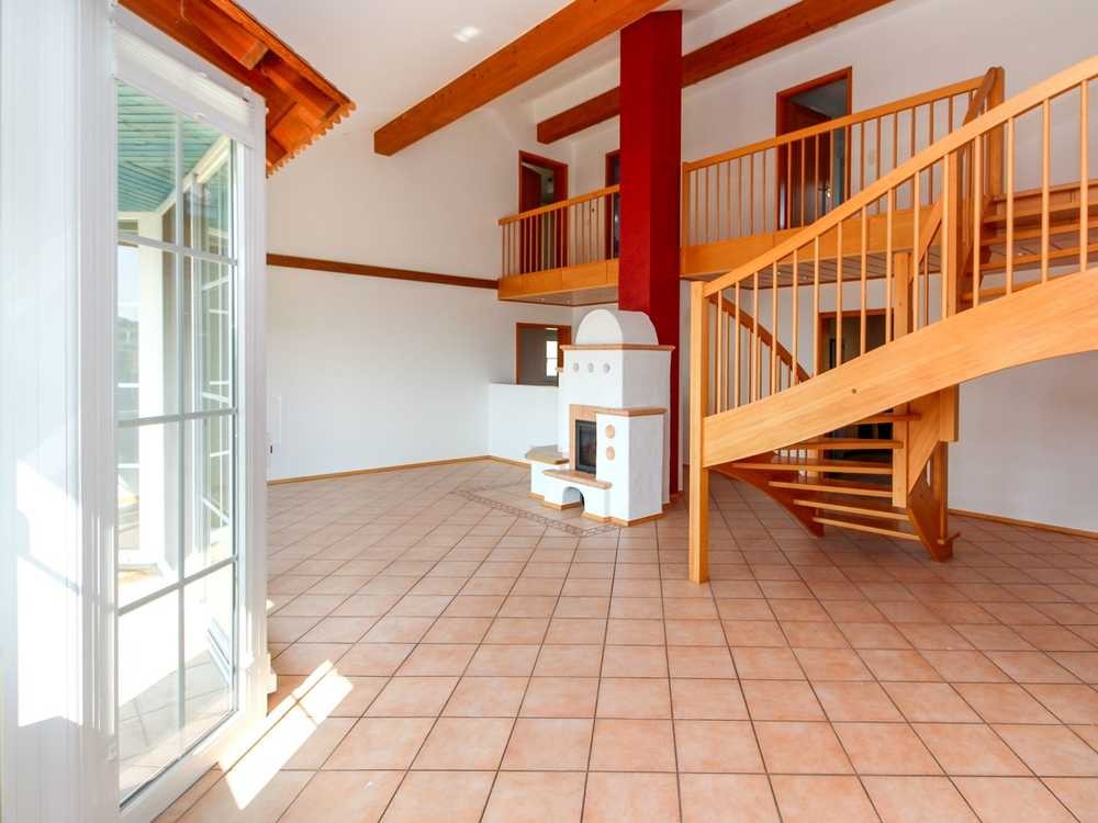 Im Obergeschoss entfaltet sich das Herzstück des Hauses: ein weitläufiger Wohnbereich, der durch seine offene Gestaltung und den Zugang zum südwestlich ausgerichteten Balkon ein Gefühl von Freiheit und Licht vermittelt. Die Empore öffnet den Raum nach oben und schafft Sichtbezüge bis ins Dachgeschoss. Der Kaminofen mit Holz sorgt für behagliche Wärme und gemütliche Abende. Die angrenzende Küche mit Einbauküche und Elektrogeräten aus dem Jahr 2018 bietet großzügigen Platz und die Möglichkeit, einen Essbereich einzurichten. Ein separates Arbeitszimmer dient als Rückzugsort – ideal für Homeoffice oder persönliche Projekte. Das Tageslichtbad mit Badewanne und Dusche rundet das Obergeschoss ab.