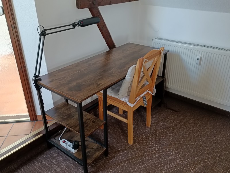 1.OG: Wendeltreppe zur Wohngalerie im 1.OG. * Über ein paar Stufen gelangt man zu den Einbauschränken unter der Dachschräge. Hier ist viel Platz für Ihre persönlichen Dinge und zusätzlicher Stauraum vorhanden. * Von der zentralen Wohnebene aus betritt man ein helles, freundliches Badezimmer. Dieses ist gefliest und mit einer Dusche, elektronischem Durchlauferhitzer, WC und Waschbecken und Badmöbeln ausgestattet. * Anschluss für Waschmaschine vorhanden! Es sind ein Arbeitsbereich und ein Freizeitbereich eingerichtet!