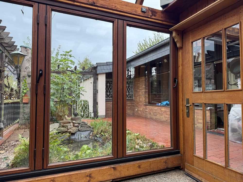 Vom Wohnzimmer geht man auf die Terrasse mit 2 kleinen Fischteichen und kann auch bei Regen oder kühlem Wetter in der mit einem spitzen Glasdach und Faltschiebetüren überdachten geschützten Terrasse an unseren antiken Ofen relaxen.