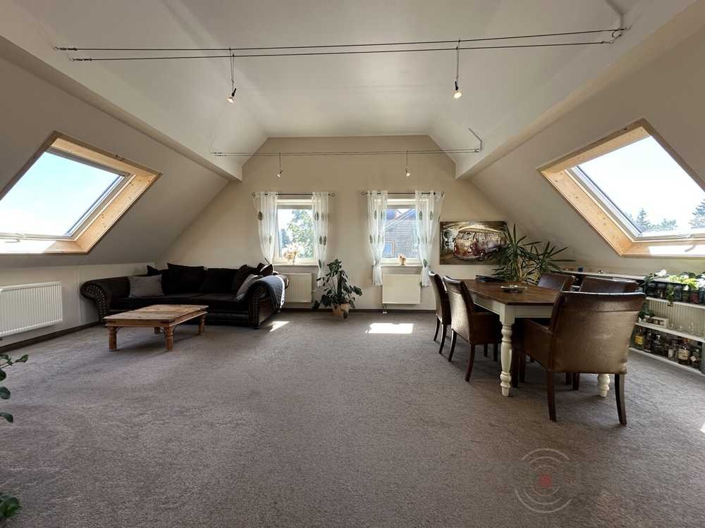 Das rund 34 m² große Wohn- und Esszimmer mit vier Fenstern und ansprechender Raumhöhe bildet das Herzstück. Von hier aus erreichen Sie die separate Küche mit großem Dachfenster und funktionaler Einbauküche.