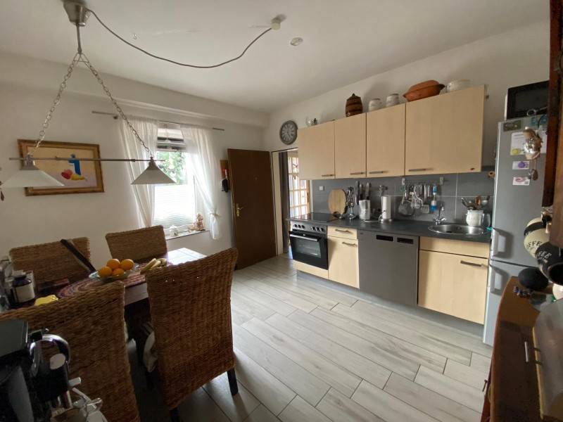 Die Wohnung liegt an der Strasse. Sie befindet sich in einem 5-Familienhaus und verfügt über einen seperaten Eingang, den man über zwei Stufen betritt. Rechts gelangt man in die Küche, Die Küche ist ausgestattet mit einer Einbauküche mit Hänge- und Unterschränken, Einbauherd mit Backofen, Spülmaschine und Kühlschrank sowie ein Esstisch mit 4 Stühlen.