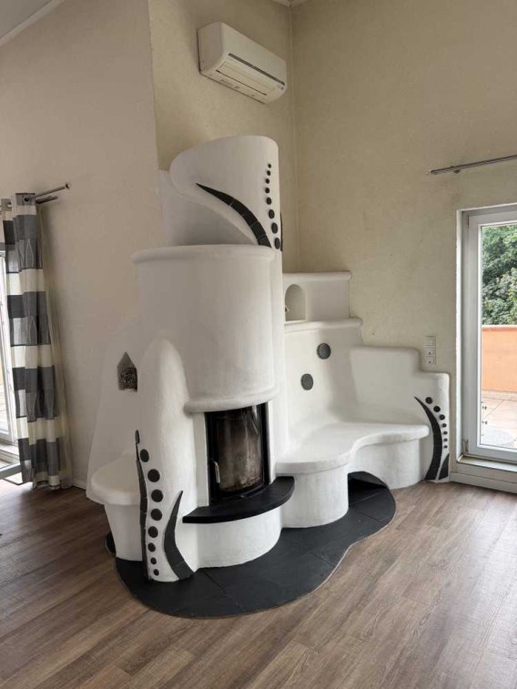 Ein großes Wohnzimmer mit bodentiefen Fenstern auf der gesamten Südseite, hohen Decken und Schrägen. Einen handgearbeiteten Kamin zur eigenständigen zusätzlichen Nutzung, eine Klimaanlage wenn es im Sommer doch mal zu warm werden sollte. Die Küche ist am Wohnzimmer angeschlossen und offen, komplett ausgestattet mit hochwertigen Geräten. Dazu gehört ein HWR direkt an die Küche angeschlossen, nützlich zur Aufbewahrung von Konserven und ähnlichem. Darüberhinaus ist dort der Anschluss für eine Waschmaschine und Trockner vorhanden.
