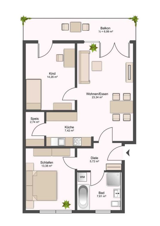 Auch der Balkon in Richtung Westen ist über das Kinderzimmer und dem Wohnzimmer mit Essbereich begehbar. Mindestens ein Stellplatz für den Pkw gehören zum Angebot.