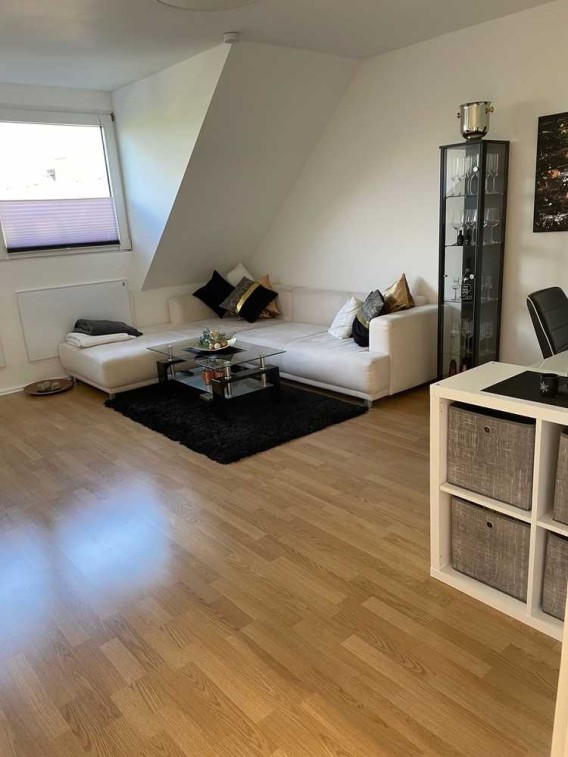 Das großzügige Wohnzimmer bietet trotz der Schräge viel Stellplatz, für eine eventuelle Schrankwand. In diesen Raum können Sie Ihrer Kreativität beim Einrichten freien Lauf lassen.