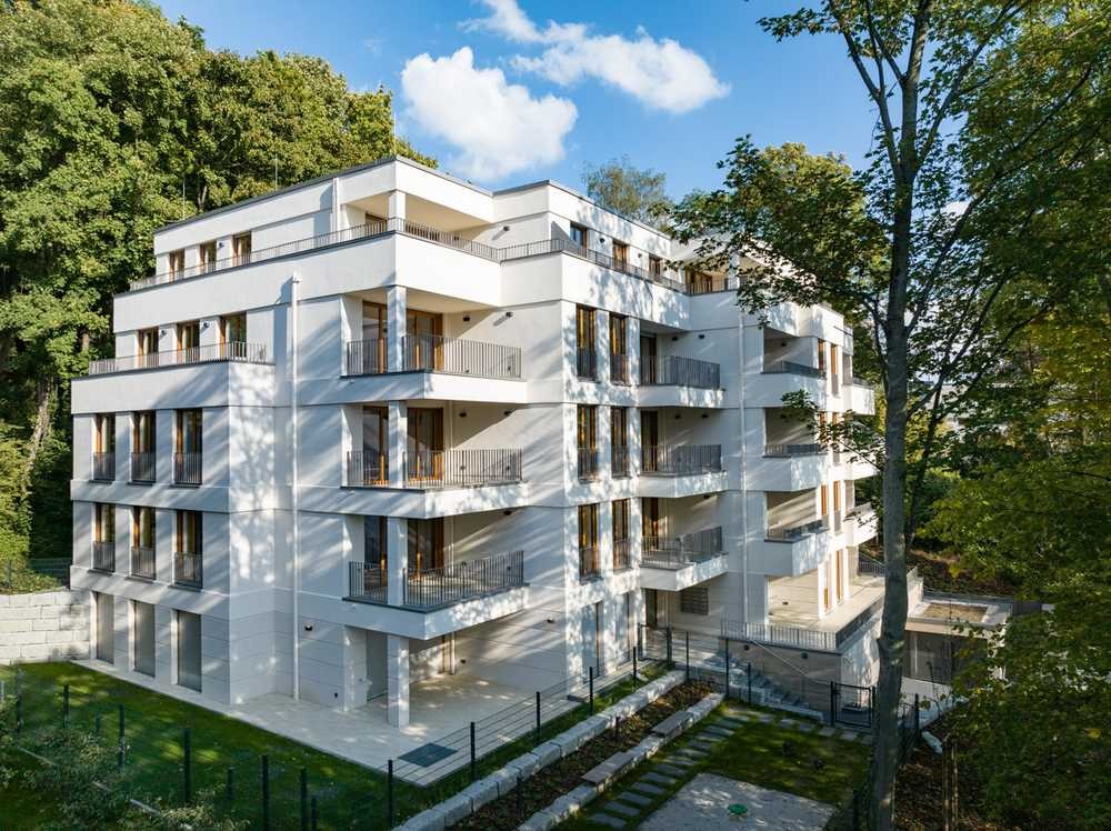 Die aufwendig gestaltete Fassade aus Naturstein, Putz sowie Bossen- und Kammputz-Elementen mit großen Fensterflächen in hochwertigen Holzrahmen erinnern an mondäne Zeiten des Klassizismus. Ihr Auto parken Sie sicher und bequem in der Tiefgarage, von hier aus gelangen Sie mit dem Aufzug oder durch das Treppenhaus, mit edlen Travertin Böden, in Ihre Wohnung. Genießen Sie diese exklusive Wohnatmosphäre inklusive des atemberaubenden Blickes über Aachen.