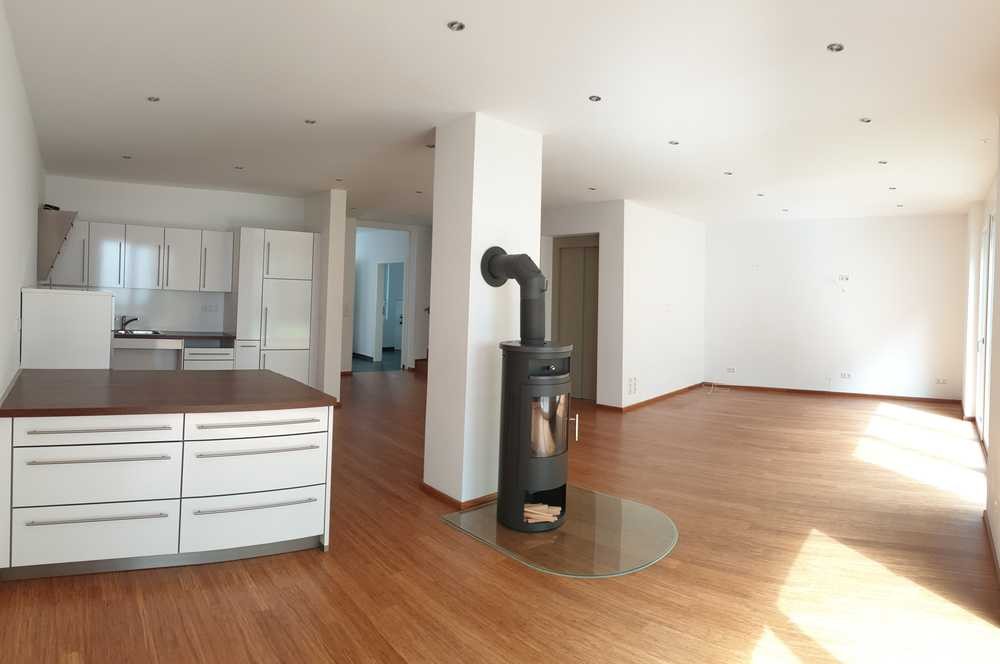 Die helle, moderne Wohnung befindet sich in einem 2011-2012 erbauten Zweifamilienhaus und erstreckt sich über zwei Stockwerke. Im Erdgeschoss liegt der großzügige, offen gestaltete Wohn- und Essbereich mit hochwertiger Küche, von dem aus eine große Glasfront einen schönen Blick auf den privaten Garten bietet. Ergänzt wird diese Ebene durch ein Gäste- oder Schlafzimmer sowie ein kleines Gästebad. Der barrierefreie Eingangsbereich ermöglicht Zugang sowohl über eine Treppe als auch über den Aufzug ins obere Stockwerk.