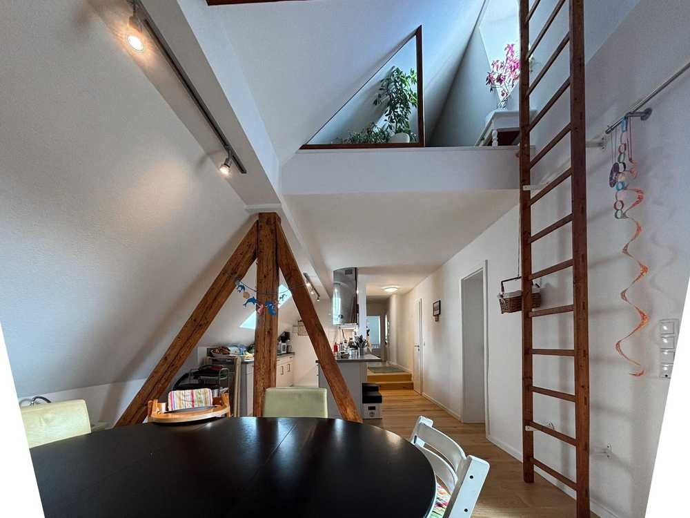 Die Wohnung verfügt über ein offenes Wohnzimmer, Flur, Kinderzimmer/Büro, ein geräumiges Schlafzimmer, Tageslichtbad mit Dusche, Gäste-WC, Küche inkl. EBK und eine weitere Schlafmöglichkeit/Stauraum über eine Treppe von dem Essbereich aus.
