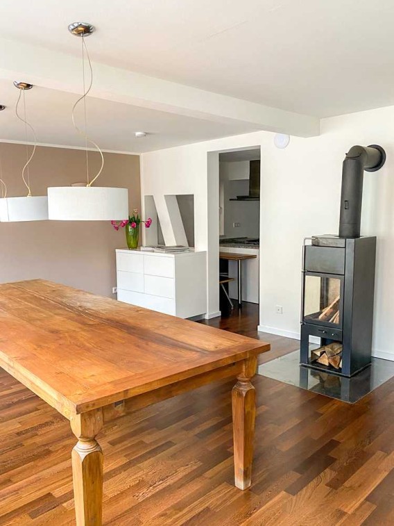 Das Obergeschoss ist das Herzstück der vielen Wohnbereiche. Über einen Flur, an welchen eine Vorratskammer mit Ausgabefenster zur Küche anknüpft, gelangt man in den großzügig geschnittenen Essbereich. Dieser Raum wird durch eine lange Tafel definiert, an welcher bis zu 12 Personen Platz nehmen können. Der Kaminofen unterstreicht an kälteren Tagen den Charme des modernen Wohnens in historischem Ambiente.