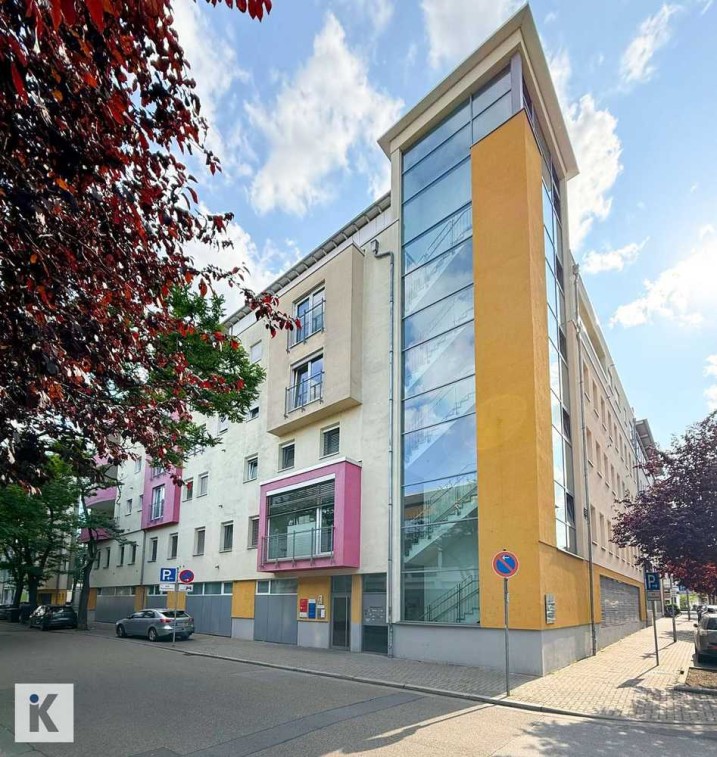 Diese barrierefreie 3,5-Zimmer-Wohnung befindet sich im vierten Obergeschoss eines Wohn- und Geschäftsgebäudes. Das Haus mit neun Einheiten (Praxen/Büros) in Frankenthal bietet ein großzügiges, gepflegtes Treppenhaus, einen Hausmeister- und Putzservice sowie einen Aufzug.