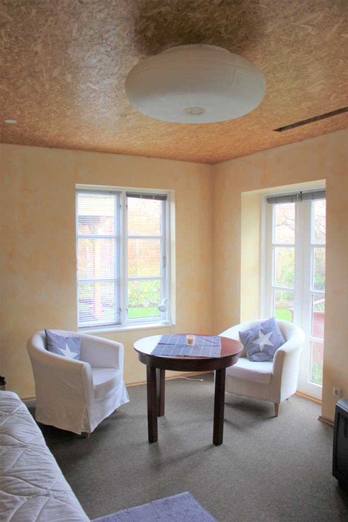 Die Wohnung im Holzhaus befindet sich in einem ruhig gelegenen Seitenflügel mit Blick auf den begrünten Innenhof. Der Zugang zur Wohnung erfolgt über das Treppenhaus eines Mehrfamilienhauses aus der Gründerzeit. Der Eingangsbereich ist durch einen kleinen geschlossenen Flur mit Fenster und Abstellmöglichkeiten für Garderobe und Schuhe gezeichnet. Anschließend tritt man in den großzügigen Wohnraum ein. Der mit Sitzbereich und Bett gestaltete Wohn-/ Schlafraum lässt durch drei Fenster, davon eines bodentief, viel Licht ein. Der offene Küchenbereich ist mit einer Einbauküche und einem Fenster ausgestattet. Das Bad mit großer Dusche, Waschtisch und WC ist mit einem Oberlichtfenster zur natürlichen Belichtung und Belüftung versehen.