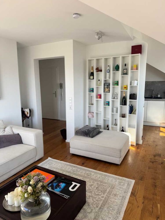 Auf rund zweieinhalb stilvoll geschnittenen Zimmern entfaltet sich ein hochwertig ausgestattetes Wohnambiente. Der offene Wohnbereich ist hell und einladend gestaltet, durchzogen von edlem Eichenparkett und akzentuiert durch moderne LED-Decken-Spots, die für eine stimmungsvolle Atmosphäre sorgen. Ein besonderes architektonisches Highlight ist die charmante Gaupe mit direktem Blick auf den Bodensee, die dem Raum Charakter und Weite verleiht.