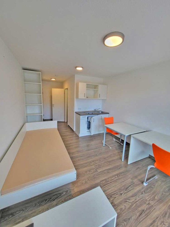 Das möblierte Studentenappartement verfügt neben einer voll ausgestatteten Einbauküche und einem toll designten Badezimmer unter anderem über einen Schreibtisch, einen Schrank und ein Bett.