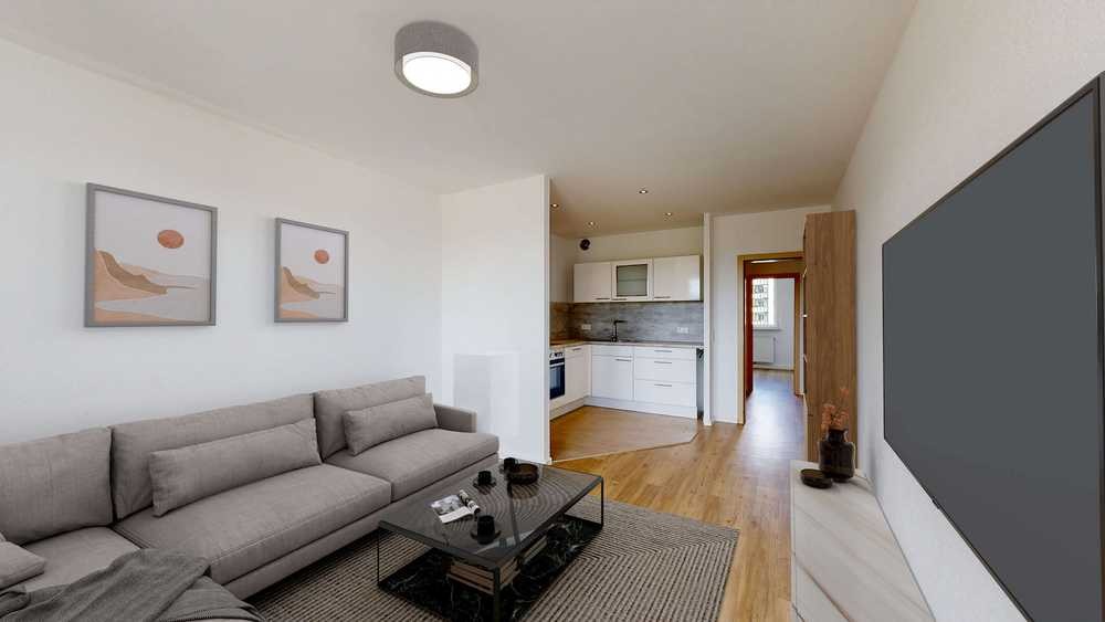 Über den Flur gelangt man in den offenen, hellen Wohn- und Kochbereich inkl. moderner Einbauküche, die von uns zur Verfügung gestellt wird! Dies wird der zentrale Lebensmittelpunkt der Wohnung. Der sonnige Südbalkon ist ebenfalls von hier aus erreichbar und bietet einen tollen Blick ins Grüne. Dieser Ausblick kann sich auf jeden Fall sehen lassen! Auf der schattigeren Seite befindet sich das Schlafzimmer, welches über eine angenehme Größe verfügt. Das Badezimmer ist innenliegend.