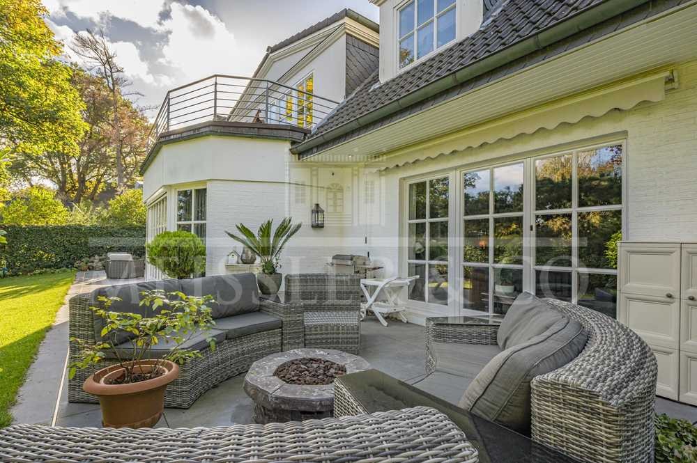 Der Garten wurde im Jahr 2021 vollständig neu gestaltet und spiegelt die Wertigkeit des Hauses auch im Außenbereich wider. Die großzügige Terrasse ist mit hochwertigen Feinsteinzeug-Fliesen belegt und wird durch eine stilvolle LED-Leiste stimmungsvoll in Szene gesetzt. Eine dichte Rhododendronhecke schützt das Grundstück vor Einblicken und sorgt für Privatsphäre.