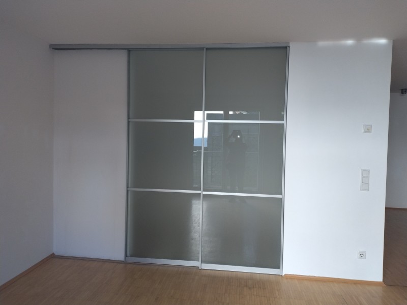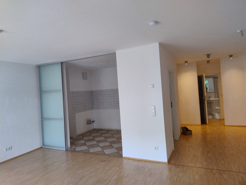 Küche durch Raumteiler vom Wohnzimmer abtrennbar. Schlafraum 1 wird durch Doppelflügeltüren vom Wohnzimmer abgetrennt und kann so individuell genutzt werden.