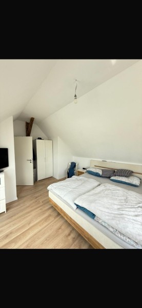 Die Wohnung hat 4 Schlafzimmer (2 im 1. OG, 2 im DG), einen großen Wohn-/Essbereich, ein Badezimmer, ein Gäste-WC sowie einen großen Balkon.