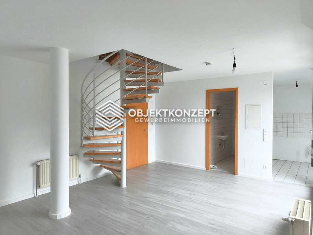 Der offene Eingangsbereich empfängt Sie freundlich und bietet direkten Zugang zum Gäste-WC sowie zum sonnigen Balkon, der sich perfekt für entspannte Stunden im Freien eignet. Der großzügige Wohnbereich geht fließend in den Koch- und Essbereich über und schafft so ein einladendes Wohngefühl. Die Wohnung verfügt über eine neue Einbauküche inklusive moderner Geräte, die im Mietpreis enthalten ist und das Kochen zum Vergnügen macht. Eine Wendeltreppe führt in die obere Etage der Wohnung. Dort erwarten Sie ein gemütliches Schlafzimmer. Das große Badezimmer mit einer Duschwanne und einem Fenster sorgt für angenehmen Komfort.