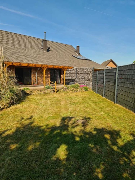 Die großen Fenster und Türen zur Terrasse schaffen eine helle und freundliche Wohnatmosphäre und verbinden den Innenraum mit dem grünen Außenbereich. Dieser beträgt inklusive Terrasse 145 qm.
