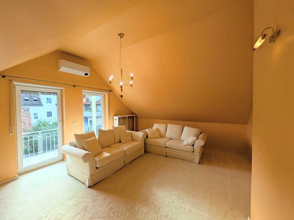 Im Obergeschoss befindet sich die Gästetoilette, ein stilvoller Essbereich mit einer hochwertigen Einbauküche (Miele Geräte, Bora Kochfeldabzug, Dampfgarer, Osmoseanlage), das Wohnzimmer, ein Badezimmer mit Dusche und Badewanne, ein Ankleidebereich mit einem großen Einbaukleiderschrank sowie das Schlafzimmer. Über das Wohnzimmer gelangt man auf einen wunderschönen großen Balkon.