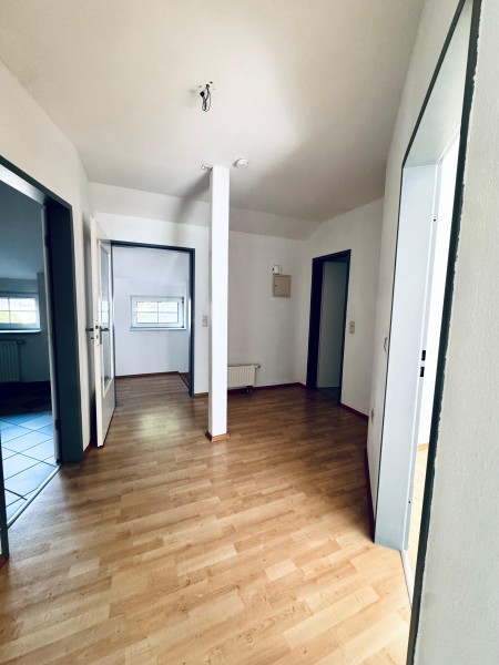 Im Erdgeschoss befindet sich ein praktischer Hauswirtschaftsraum, die Wohnräume sind in der 1. Etage. Hinauf führt eine gerade Treppe mit 16 Stufen. Vom Flur aus gelangen Sie in zwei gut geschnittene helle Zimmer, eine geräumige Küche mit Einbauküche und ein großzügiges Badezimmer mit Dusche.