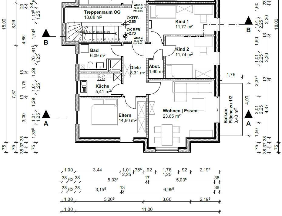 In einem modernen Neubau-Sechsfamilienhaus erwartet Sie eine helle und freundliche 4-Zimmerwohnung im 1. OG mit rd. 87 qm Wfl. Der großzügige Wohn- und Essbereich ist das Herzstück der Wohnung und bietet viel Raum für gemütliche Stunden. Von hier aus gelangen Sie auf den schönen Südost-Balkon mit Blick auf den angrenzenden Bach. Die Wohnung bietet zudem eine abgeschlossene Küche mit moderner Einbauküche inklusive allen Elektrogeräten, ein helles Badezimmer mit großer Dusche und Waschmaschinenanschluss, sowie drei Schlafzimmern und einem Gang mit praktischer Garderoben-Nische. Für noch mehr Komfort sorgen die Fußbodenheizung, integrierte Be- und Entlüftungsanlage, hochwertige Holzständerbauweise, 3-Fach-verglaste Fenster mit Rollläden und moderne Vinyl- und Fliesenböden. Für Stauraum sorgt der dazugehörige Abstellraum. Ein Carport- und ein Außenstellplatz runden das Gesamtpaket ab. Die Grundmiete versteht sich zuzüglich EUR 100 für die hochwertige EBK, EUR 30 für einen Außenstellplatz und EUR 50 für einen Carport-Stellplatz. Die mtl. Nebenkostenvorauszahlung beträgt EUR 150. Der Bezug ist ab 01.01.2026 möglich.