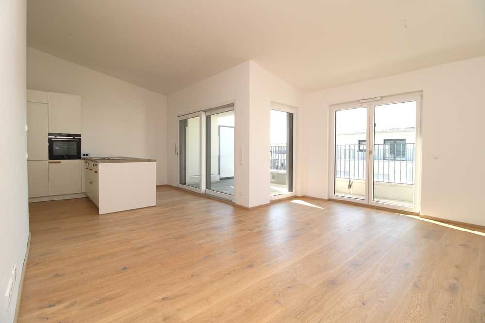 Im Dachgeschoss der RIEGERHÖFE finden Sie diesen wahr gewordenen Terrassentraum. Auf den 94,53 m² erstrecken sich hier drei wunderschön geräumige Zimmer und laden Sie zum harmonischen Wohnen ein. Der Wohn-, Ess- und Kochbereich ist ein offen gestalteter und heller Raum, welcher Sie mit einer voll ausgestatteten Einbauküche mit hochwertigen Markengeräten empfängt. Durch den Wohnbereich gelangen Sie zum Highlight der Wohnung: eine Dachterrasse mit südlicher Ausrichtung sowie Alpenblick! Im Schlafzimmer wird durch die bodenbündigen Fenster eine freundliche und einladende Atmosphäre geschaffen. Hier gibt es ebenfalls einen Zugang zu einer weiteren kleinen Dachterrasse, auf der man die Morgensonne begrüßen kann. Das Wannenbad befindet sich zwischen dem Schlafzimmer und Gästezimmer und ist zusätzlich mit einer bodengleichen Regendusche, Tageslicht, Handtuchheizkörper und einem Waschmaschinenanschluss ausgestattet. Gegenüber vom Wannenband gelangt man zu einem Duschbad/Gäste-WC. Natürlich wird in den RIEGERHÖFEN auch auf modernste und hochwertigste Ausstattung gesetzt. In ihr enthalten ist eine Videogegensprechanlage, ein elektrisch betriebener Rollladen sowie ein Eichenechtholz-Landhausdielenboden. Die Wohnung wird komplett mit Fußbodenheizung beheizt. Ein Personenaufzug befördert Sie von der Tiefgarage bis ins Dachgeschoss und Sie haben außerdem Zugang zu einem privaten Kellerabteil sowie einem abschließbaren Fahrradkeller. Ihr neues Zuhause im Neubauareal RIEGERHÖFE wartet schon auf Sie. Zur Wohnung gehören zwei Tiefgaragenstellplätze, welche für insgesamt 160,00 € monatlich mit angemietet werden müssen.