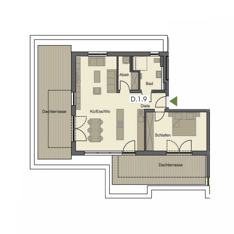 Die nach Südwesten ausgerichtete Anlage überzeugt durch einen unverbaubaren Blick ins Grüne und eine durchdachte Architektur: Erdgeschosswohnungen verfügen über großzügige Terrassen mit Gartenanteil, im Obergeschoss laden überdachte Balkone zum Entspannen ein, und im Dachgeschoss stehen weitläufige Dachterrassen zur Verfügung.