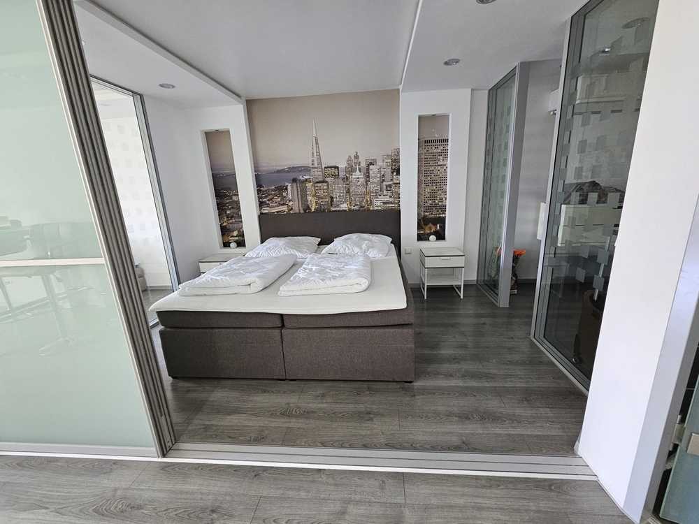 Größe und Layout: Mit einer großzügigen Fläche von 58 m2 und 2 Zimmern bietet dieses Apartment ausreichend Platz für Komfort und Entspannung. Ein Raum wird durch eine elegante Glaswand getrennt und verfügt über einen begehbaren Kleiderschrank mit einem imposanten Spiegel und eingebauten Regalen.
