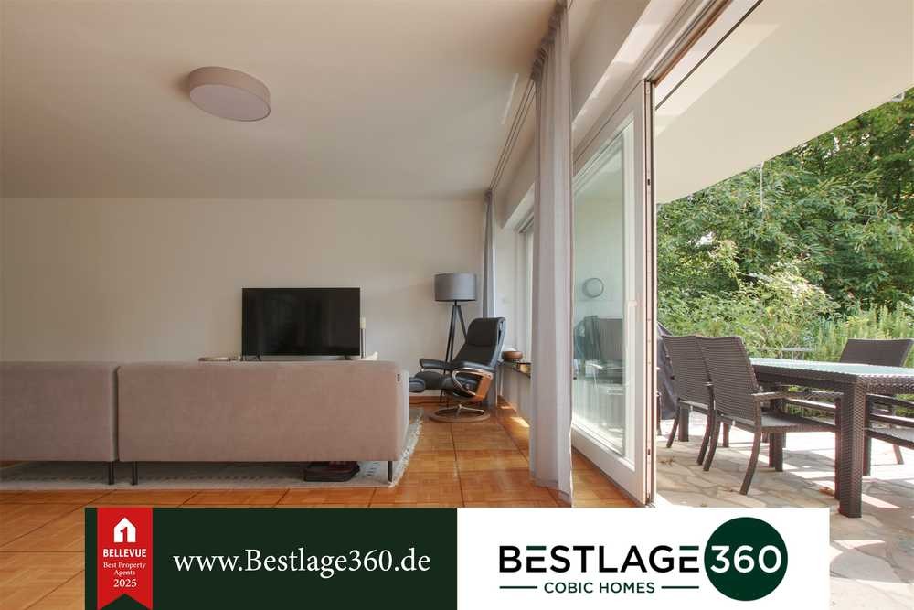 Der helle und offen gestaltete Wohn- und Essbereich bietet viel Raum zum Wohlfühlen und gewährt direkten Zugang sowohl zur Terrasse als auch in den Garten.
